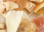 Zutaten: Bananenstücke (?), Mangostücke (?), Kokoschips, Apfelstücke weiß, Papayastücke (?), Orangenecken, Aroma.